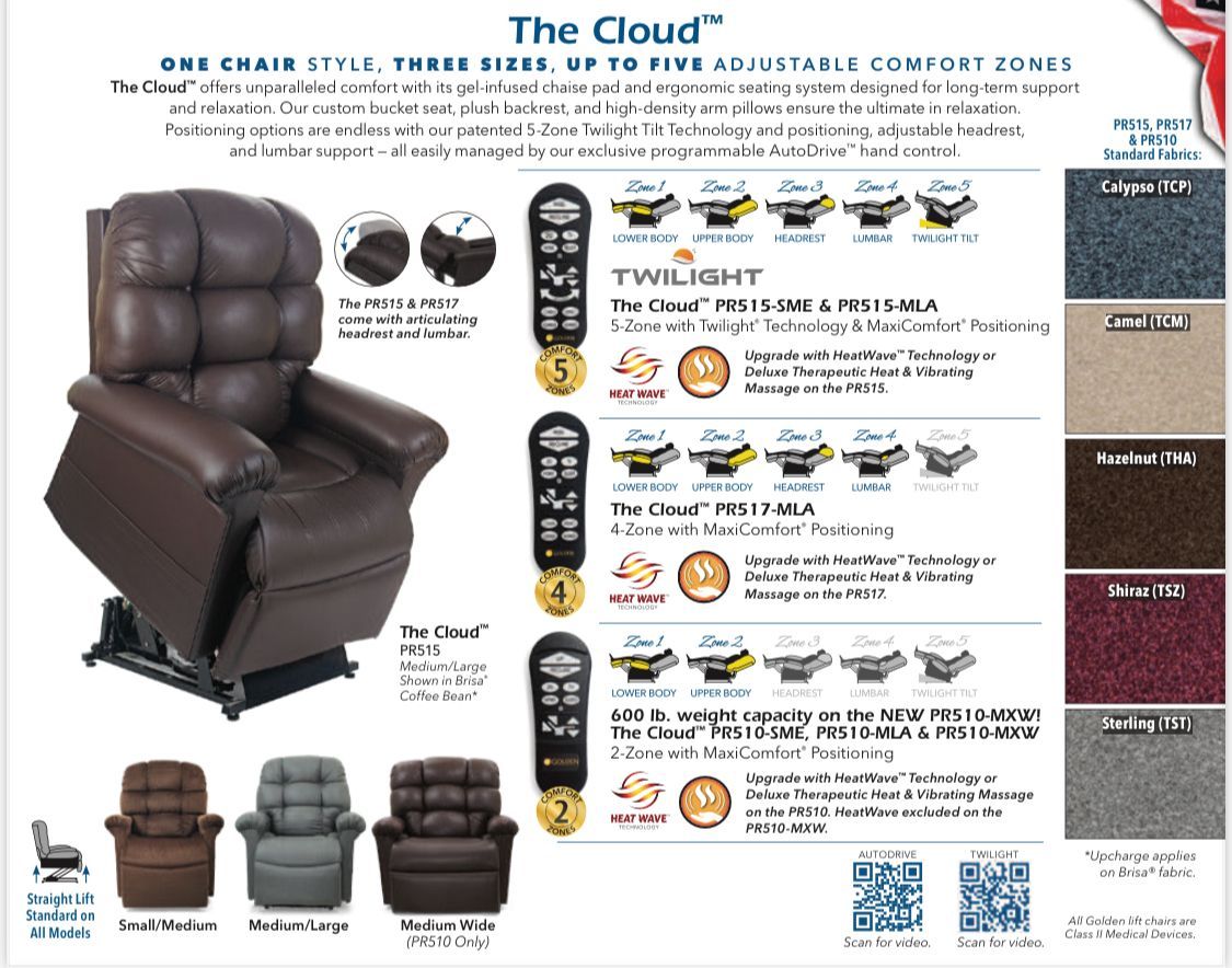 These power chairs rise and tilt, making them easier to use when you have problems with your legs or hips. We also offer a number of different styles and features to help maximize your comfort and mobility. Learn more about the world-famous Cloud+, one of the most incredible, life-changing lift chairs on the market!